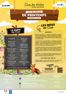 Plaquette jeunesse Programme Clos du Vivier - 6/10 ans - Vacances de Printemps 2026 1 document Publié le 27 mars 2026 Retrouvez les programmes du Clos du Vivier des vacances de Printemps 2026 pour les 6/10 ans WEB-Prog_Clos_ELEM-PRINTEMPS.pdf (.pdf, 893,2 Ko) Télécharger PrécédentRetour à la listeSuivant