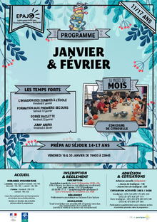 Plaquette jeunesse Programme EPAJG Bourg / 11-17 ans - Mercredis de janv/fév. 2026 1 document Publié le 07 janvier 2026 Retrouvez le programme des activités des mercredis de janv/fév. 2026. WEB-EPAJGBourg-ProgAdos-JANV_FEV.pdf (.pdf, 1,5 Mo) Télécharger PrécédentRetour à la listeSuivant