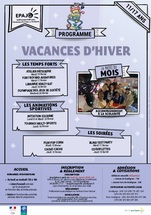 Plaquette jeunesse Programme EPAJG Bourg / 11-17 ans - Vacances d'Hiver 2026 1 document Publié le 12 janvier 2026 Retrouvez le programme des activités des vacances d'Hiver 2026 WEB-EPAJGBourg-ProgAdos-HIVER.pdf (.pdf, 2,0 Mo) Télécharger PrécédentRetour à la listeSuivant