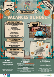 Plaquette jeunesse Programme EPAJG Bourg / 11-17 ans - Vacances de Noël 2025 1 document Publié le 05 décembre 2025 Retrouvez le programme des activités des vacances de Noël 2025 WEB-EPAJGBourg-ProgAdos-NOEL.pdf (.pdf, 1,6 Mo) Télécharger PrécédentRetour à la listeSuivant