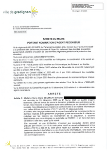 Actes d'administration générale ARRETE 004 : RECENSEMENT DE LA POPULATION - AGENT RECENSEUR 2025/2026 - Mme BECMEUR 1 document Publié le 30 décembre 2025 RECENSEMENT_POPULATION_AGENT_2026_004.pdf (.pdf, 2,0 Mo) Télécharger PrécédentRetour à la listeSuivant
