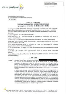 Actes d'administration générale ARRETE 2026-003 : RECENSEMENT DE LA POPULATION - AGENT RECENSEUR 2025/2026 - Mme BECMEUR 1 document Publié le 24 février 2026 RE_2026_003.pdf (.pdf, 1,9 Mo) Télécharger PrécédentRetour à la listeSuivant